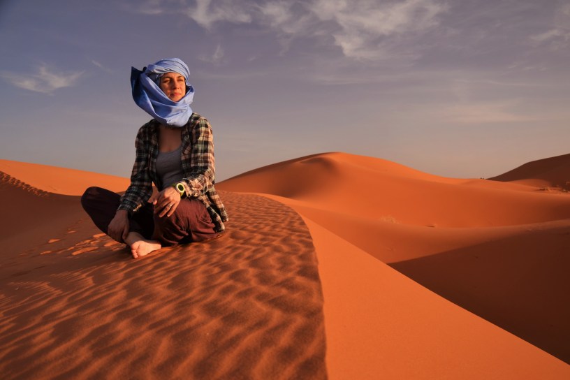 Rychle balíme do malých batůžků věci potřebné pro přespání v pouštním kempu, potkáváme našeho berberského průvodce Hamida, s jehož pomocí si vážeme šátky. Naším dopravním prostředkem budou velbloudi. Už jsem na velbloudu jednou jela v Číně, ten mi ale připadal trochu nižší a hlavní rozdíl byl ten, že byl dvouhrbý (tzv. drabař), tentokrát tedy změna a jedeme na dromedáru. Hamid se snaží být vtipný, a pro uvolnění atmosféry nám prozrazuje, že naši velbloudi se jmenují Bob Marley a Jimi Hendrix. Nezbývá, než se pevně držet při nasedání na ty naše velbloudí osobnosti, a jen my s Hamidem vyrážíme do písečných dun. Jsme rádi, že nejsme součástí velké turistické skupiny.