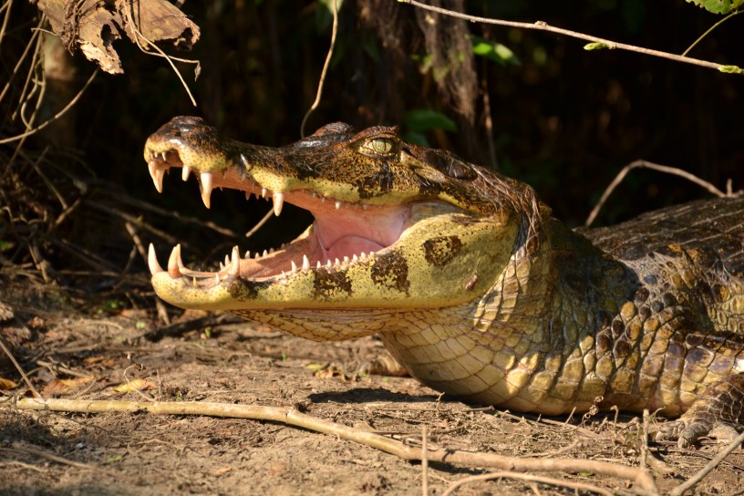 Večer jedeme masově na lodi sledovat západ slunce nad pampou. Po cestě zpět ve tmě počítáme svítící oči kajmanů nad hladinou, každý na jedné straně lodi, a opravdu jich tu jsou stovky, hlavně mezi ně nespadnout. Ráno zase plujeme (tentokrát už soukromě) na východ slunce – vyráží se v 6 ráno a snídaně je až poté.