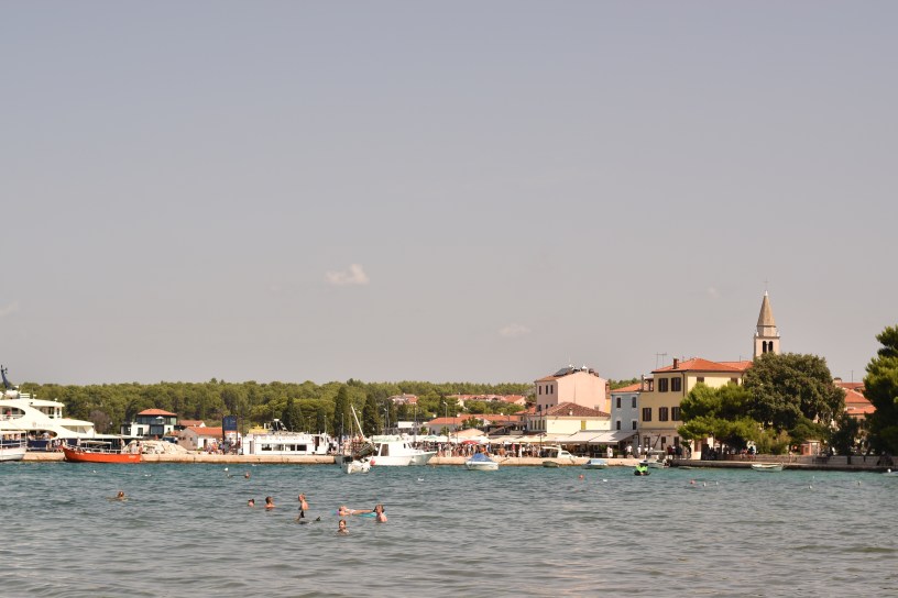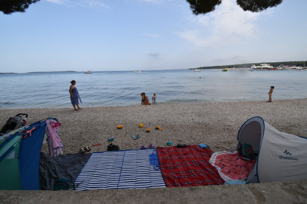 Nakonec jsme se obě dvě rodinky šťastně sešly ve Fažaně a byla pravda, že městečko to bylo moc hezké, sympatické, menší, s výběrem restaurací, stánky se zmrzlinami i pekárnami s výborným burkem. Pláže pozvolné a oblázkové, což bylo pro nás i děti fajn. I menší vlny jsme si užívali. U pláže se dalo schovat před sluncem pod borovice, takže ideální. Když jsme se potřebovali protáhnout nebo si skočit pro kávičku a něco na zub, došli jsme pohodlně promenádou kousíček do města. Nakupovat potraviny a pitivo jsme jezdili do většího supermarketu Plodine přímo ve Fažaně, kde byl velmi pestrý výběr.