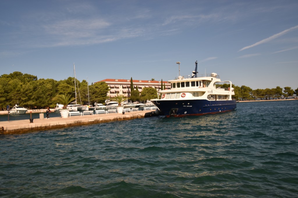Přímo z přístavu ve Fažaně vyjíždějí pravidelně lodě do nedalekého ostrovního Národního parku Brijuni. Určitě sem vyplujte a rozhodně si zaplaťte organizovanou prohlídku s výkladem včetně jízdy vláčkem. Lístky koupíte v turistické kanceláři přímo u přístavu. Tato varianta byla bohužel již vyprodaná, když jsme se rozhodli do NP Brijuni plout. Hlavní ostrov je velký, na pěšky to moc není, což jsme otestovali a pak jsme si s dětmi naštěstí vláček s několika posledními volnými místy stopli. Naštěstí byl průvodce ochotný a vzal nás. I ten kousek jízdy a výkladu, který jsme stihli, byl opravdu zajímavý. Na ostrově se nachází bývalá rezidence prezidenta Tita, jsou tu středověké a antické památky, safari a parky. Pokud sem vyrazíte na vlastní pěst, můžete si na ostrově půjčit kola nebo elektrická vozítka, která se nám zdála drahá a nechtěli jsme čekat frontu. Tak jsme došli do safari části ostrova pěkně po svých. A mimochodem – safari moc hezké a s kioskem s občerstvením. Park s dinosauřími stopami, od kterého děti čekaly něco ve stylu Dinoparku v Plzni, je kvůli pouze jedné soše tyranosaura docela zklamal. Nedaleko od přístavu v Brijuni je krásná a hlavně písčitá pláž, takže plavky rozhodně s sebou!