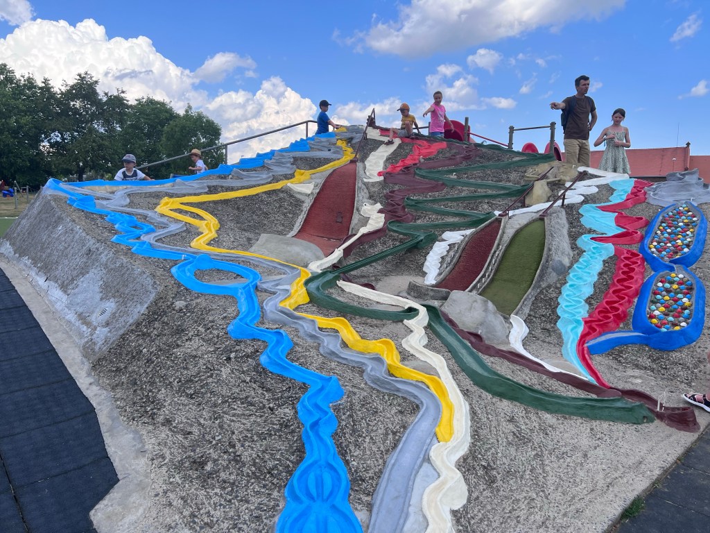 Tohle dětské hřiště s dopravním hřištěm je pro děti perfektní. Naše děti milují hlavně místní velkou kuličkodráhu. Vydrží si posílat kuličky různobarevnými dráhami hodně dlouho. Skleněné kuličky tu můžete koupit.
