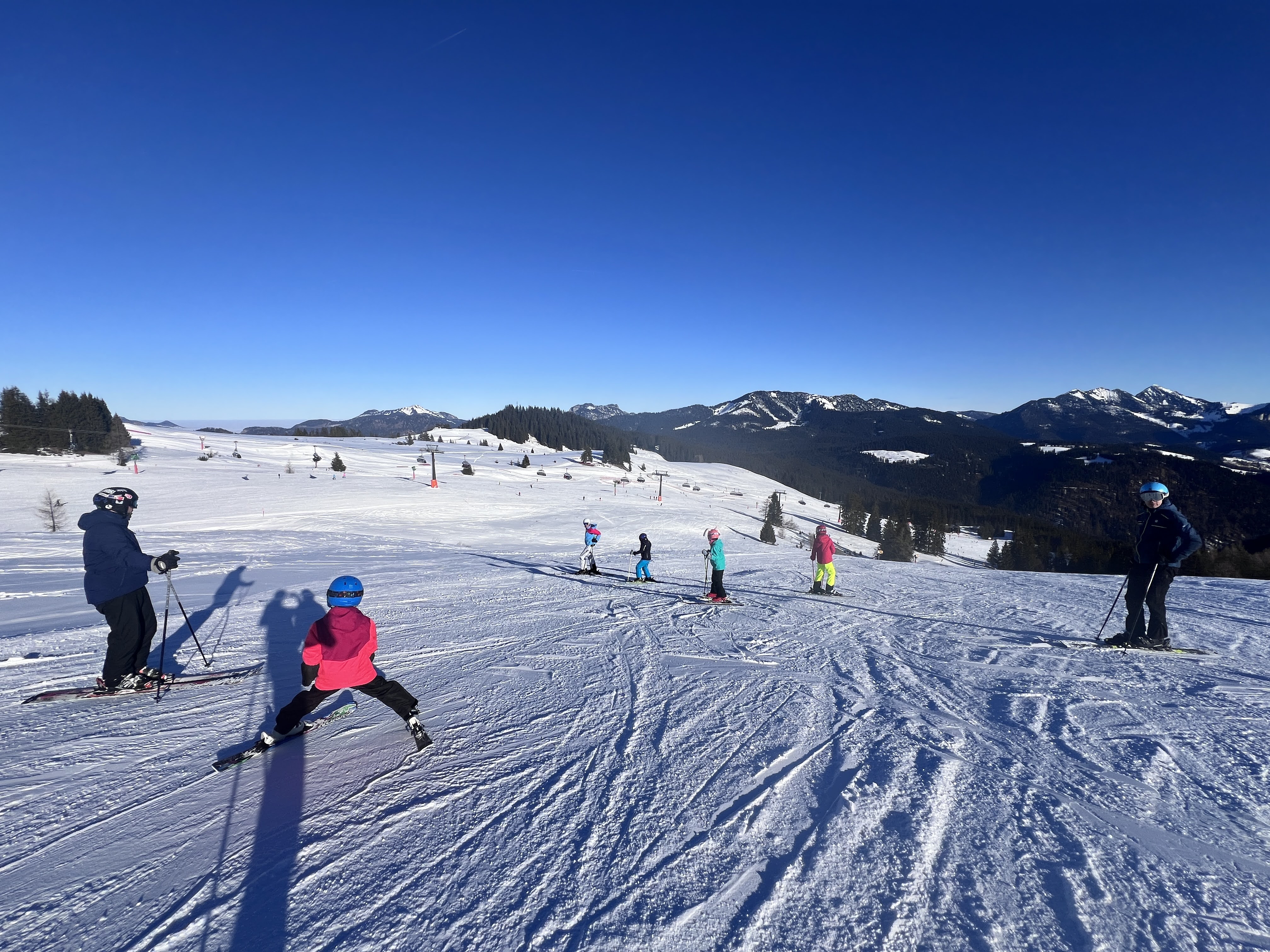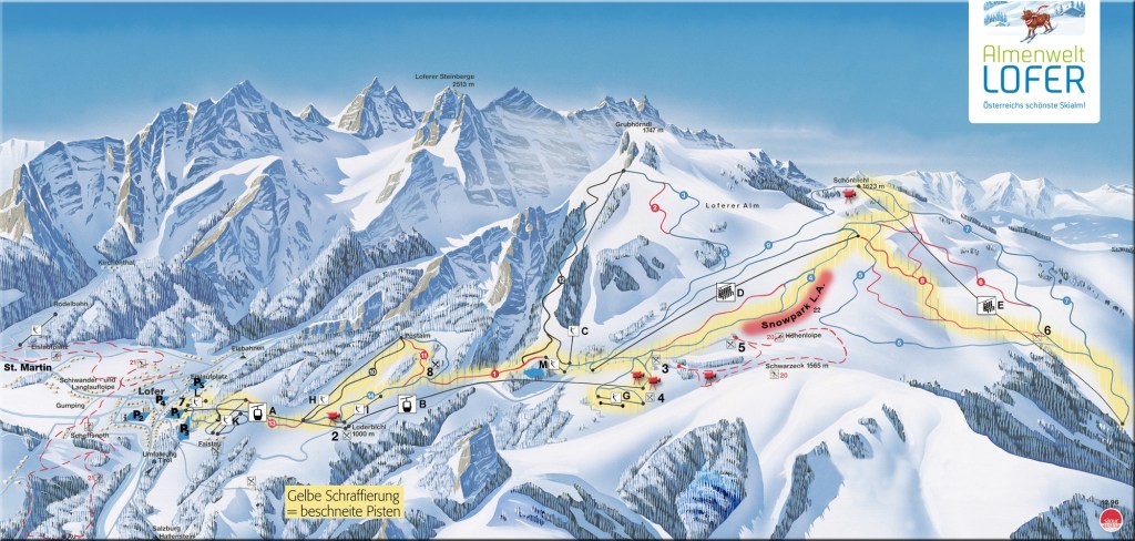 Nejvýše položené, nejdražší a nejrozlehlejší z porovnávaných středisek byl Waidring. Jeli jsme sem v pátek, takže tu nebylo tolik narváno. Lanovky jsou tu opravdu moderní a hodně z nich vyhřívaných. Měla jsem trochu problém s orientací ve srovnání s menším St. Johannem a Loferem. Tady to byla skoro jedna lanovka nad druhou. Sjezdovky úžasné, široké, přehledné a celkově to tu bylo hodně slunečné. Taková náhorní plošina. Vyjeli jsme si i na nejvyšší vrchol ve výšce 1869 m, tady byly super výhledy a červená sjezdovka dolů byla pohodová i pro děti. Ty jinak nejvíce brázdily místní funpark, ten je bavil moc!