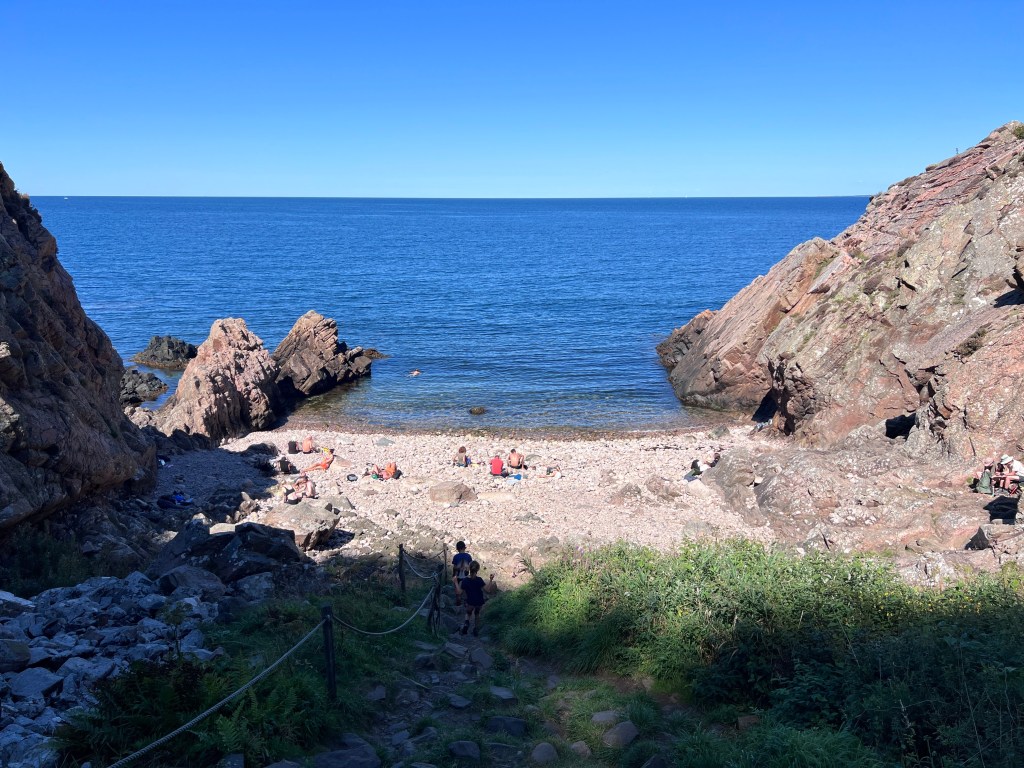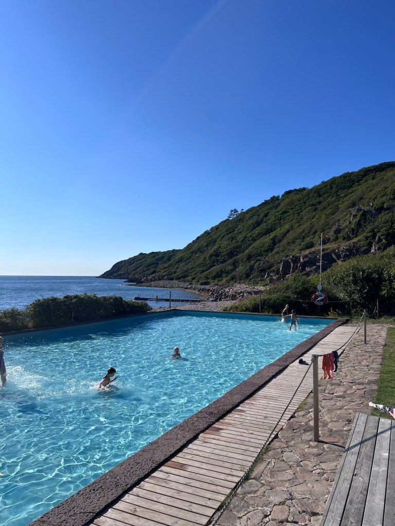 Jeli jsme se vykoupat do nedalekého městečka Mölle na místní plovárnu u moře, kde byla samostatná nudistická pláž jen pro ženy (!), brouzdaliště pro děti ve formě bazénu, a taky hezká kamenitá pláž a vstup do moře z mola – poprvé jsem tam vlezla a bylo to vlastně fajn, ani jsem nebyla moc zmrzlá – bylo totiž teplo a nefoukalo…