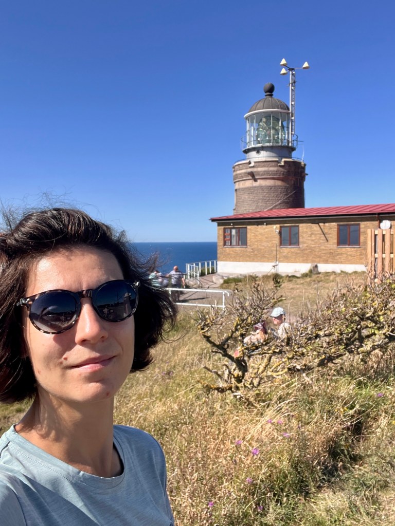 Poté jsme přejeli do centralnejsi části poloostrova Kullaberg a vydali se po severní straně po modré turistické značce směrem na západ k ikonickému majáku Kullens Fyr, kde je i návštěvnické centrum Naturum Kullabergu, opět velmi hezké – a kavárna.