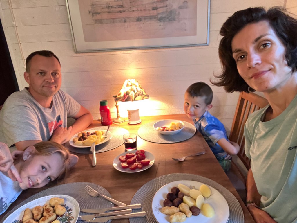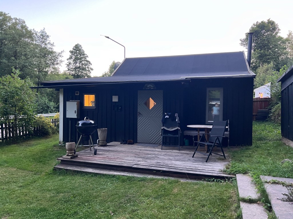 Poté jsme se se zastávkou na nákup přesunuli na sever do našeho prvního ubytování ve švédské chatičce u ubytovatele Kima, místního důchodce, co tráví léto ve Švédsku a zimu v Thajsku. Bukli jsme si chatičku den dopředu přes Airbnb. Byla za skvělých 1300 Kč na noc! Sice u silnice, ale i tak moc hezká! Aspoň jsme využili troubu a sporák a upekli si mražené kuřecí stripsy, švédské masové koule (köttbullar) a uvařili brambory. Večer jsme plánovali další dny, zatímco dětičky hezky spaly vedle nás v obýváku na rozkládací pohovce.