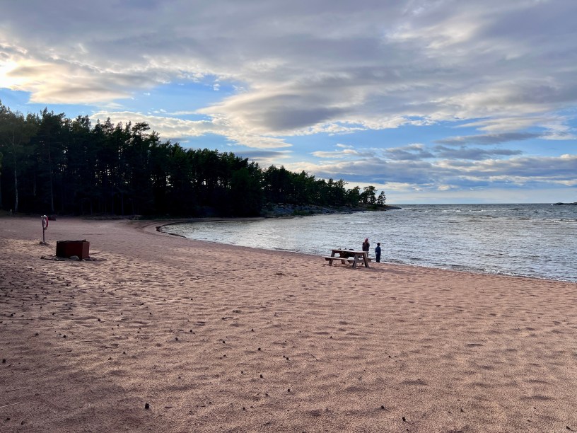 V přístavu máme asi 1,5 hodiny než má podle řádu přívoz jet – má jet v 17 hodin. Je to tu hezké a nebýt větru, je i docela teplo. Děti se koupou na pláži, my vegetíme na obřím dřevěném lehátku, dáváme si kanelbullar a pivo a Přéma zkouší z mola chytat ryby.